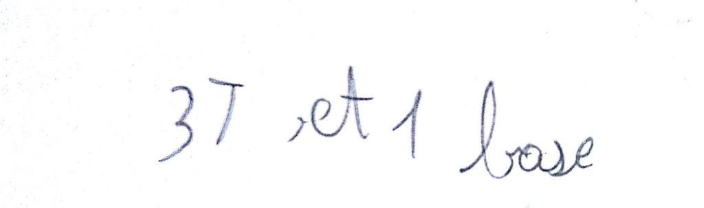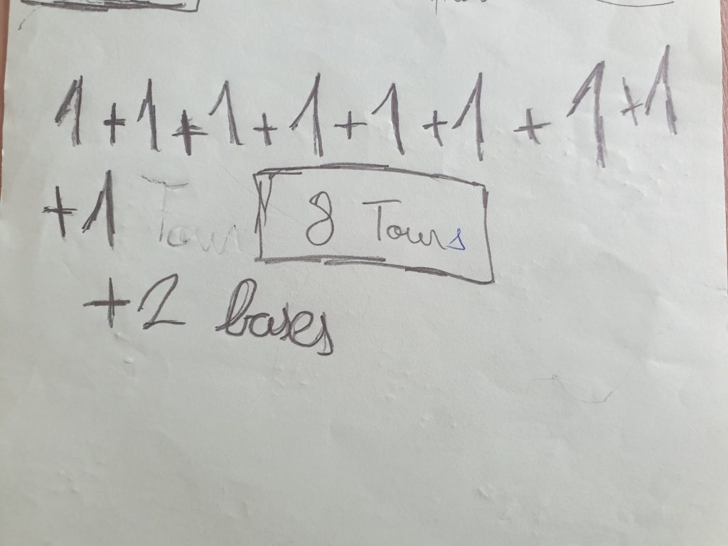 - écriture progressive d’une suite de « 1 » correspondant à chaque tour complet réalisé puis ajout du nombre de bases atteintes au dernier tour