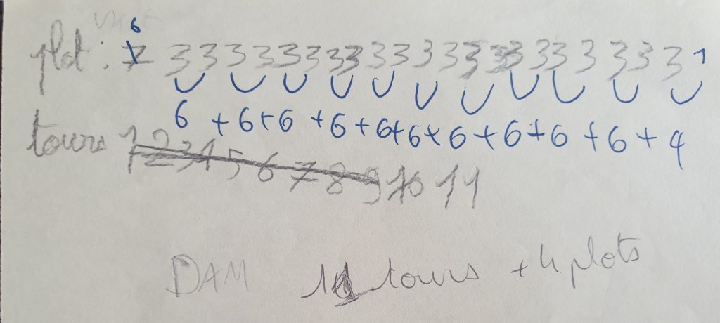 - Voilà notre analyse de la production : comptage des plots 3 par 3, certainement pour envisager des moitiés de tour, puis groupement 2 à 2 pour obtenir les tours complets, dénombrement final des tours complets et des plots restants.↩︎