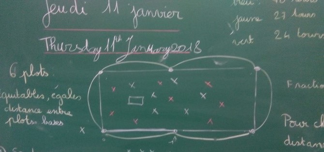 Les élèves sont alors invités à repérer les différents sixièmes du parcours, représentés au tableau , puis à transformer les scores précédemment établis en tours/plots pour faire apparaître le maximum de tours entiers.