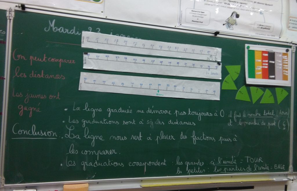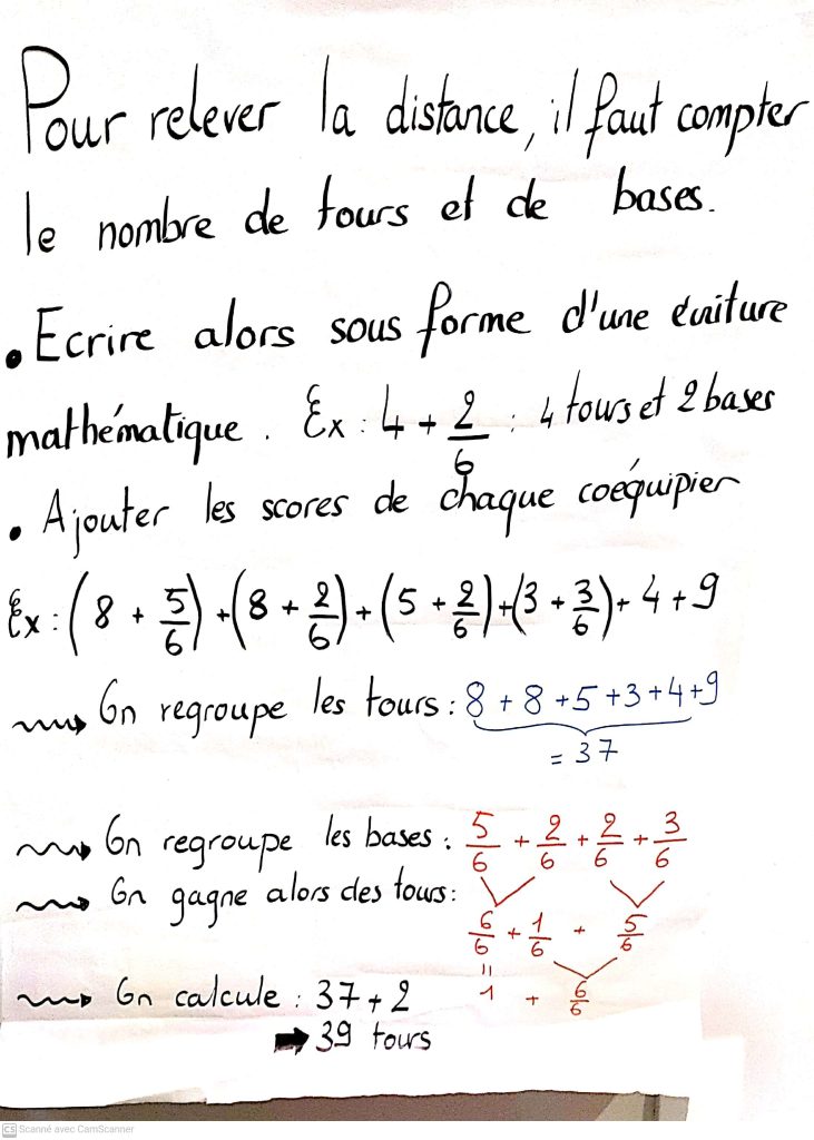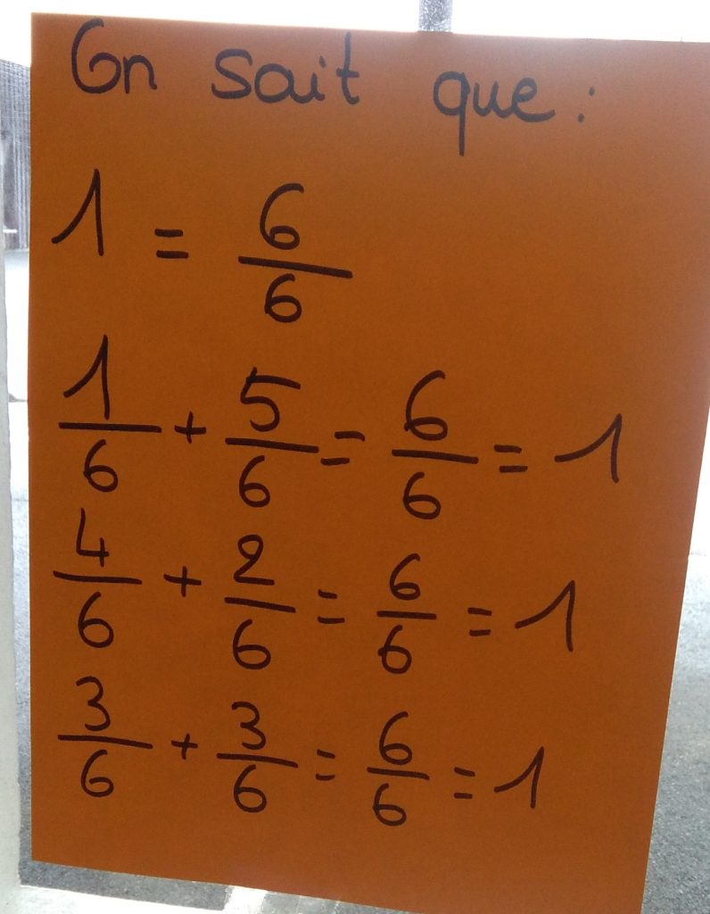 Des échanges permettent également de comparer différentes procédures d’addition des fractions. La classe s’accorde sur celle qui servira de référence pour rendre compte du score en équipe : une affiche est réalisée.
