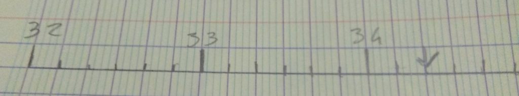 Finalement la classe se met d’accord : « C’est comme si on zoomait, on va prendre un carreau pour représenter un sixième de tour et la ligne va commencer à \({32}\). ».