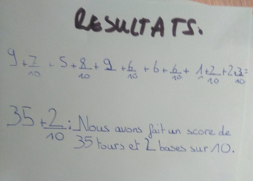 Au retour dans la classe, les calculs des scores d’équipes sont effectués en petits groupes puis mutualisés et vérifiés par le groupe classe.